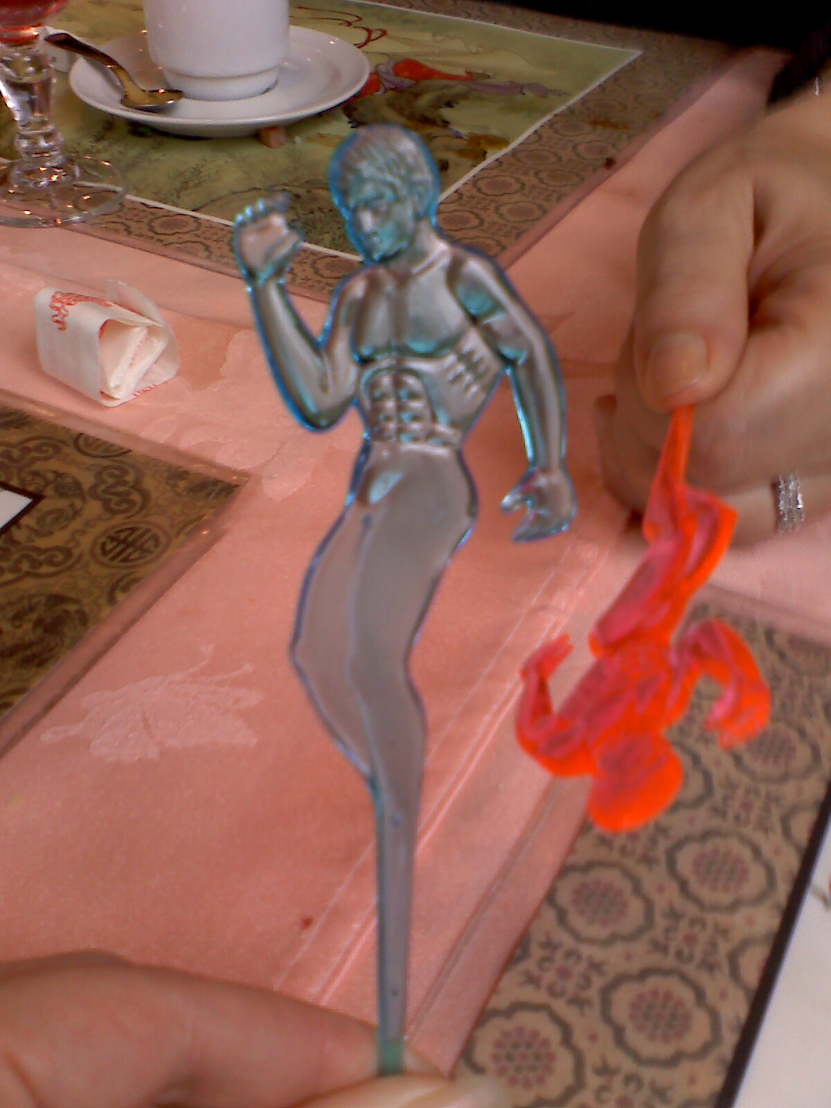 I returned to the table, disappointed. I looked up at my mother-in-law’s glass & saw the pink plastic sex taunting me from the rim of her glass. With my efforts to find evidence of some sexy secret of the Thai restaurant thwarted, there was only one thing for us to do with these things.