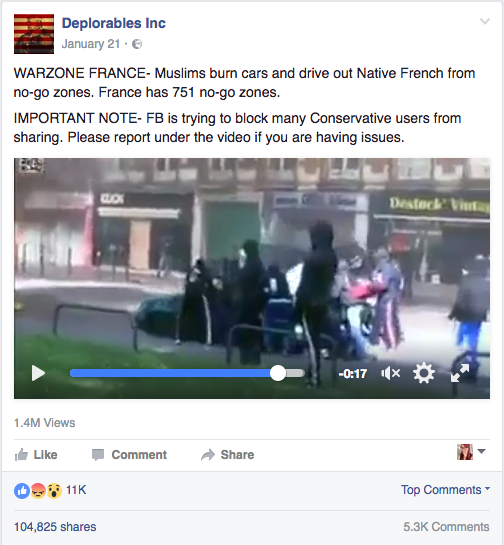 Twitter and Facebook are teeming with photos and videos of various incidents with all context removed so that bigots and propagandists can fit them into their deranged and fictional narrative of evil, violent, Muslim refugees. If you take a grainy video, remove the time, date, and specific location where the event took place, it becomes easy to assign whatever story you want to it. People who post these videos without all of the details are not trying to inform you. They want to stroke the shaft of your confirmation bias until you jizz hate all over their comment section and share button. And with 104k+ shares, it’s obvious that FB is not blocking anyone from sharing. Making it seem forbidden fans the flames of conspiracy theories and paranoid delusions.