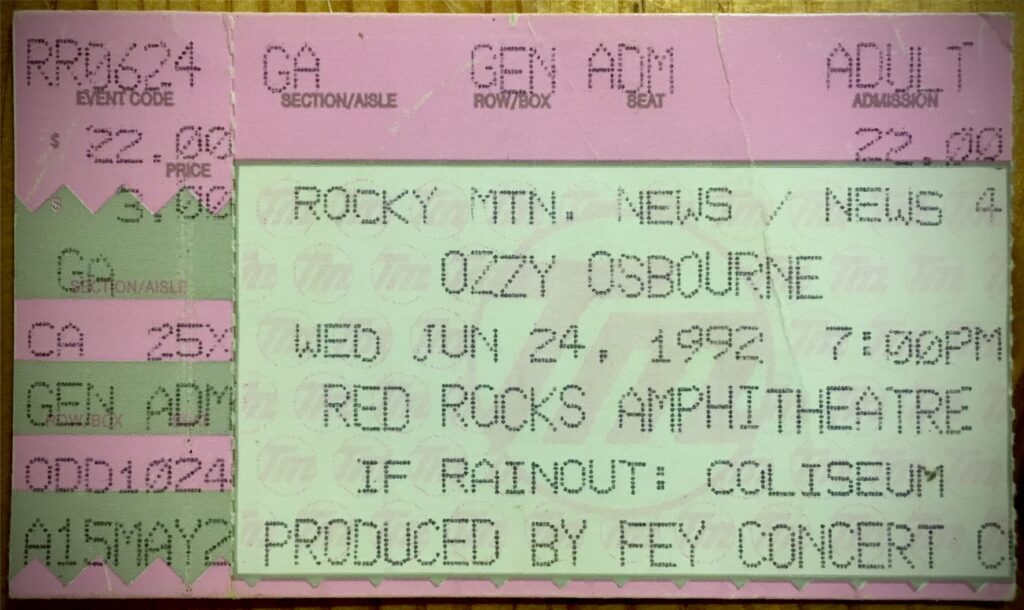 So, I said “yes” when my friend Lisa asked me if I wanted to go along with her and a few of her neighbors to go see Ozzy at Red Rocks. She sold it well. “We’re renting a limo. It’ll be a total party.” I’d never ridden in a limo. (And still haven’t.) I was excited to cut loose after getting rid of that abusive piece of shit, so I said “yes” despite it being an Ozzy show. I also did it for spite itself. To spite that asshole who’d upended my life. I’d go see his favorite singer while he sat in jail for assault.